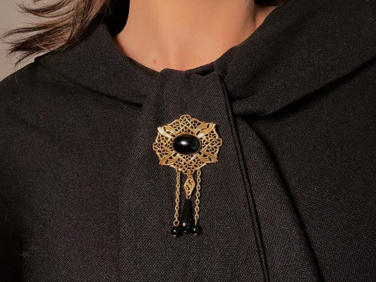 Black Victorian Brooch, Antique Filigree Pin with Black Cameo & Chain Tassels Romantic Victorian Revival Jewelry