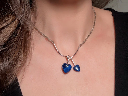 Blue Heart Necklace, 70s Vintage Silver Necklace with Double Heart Faux Lapis Pendant