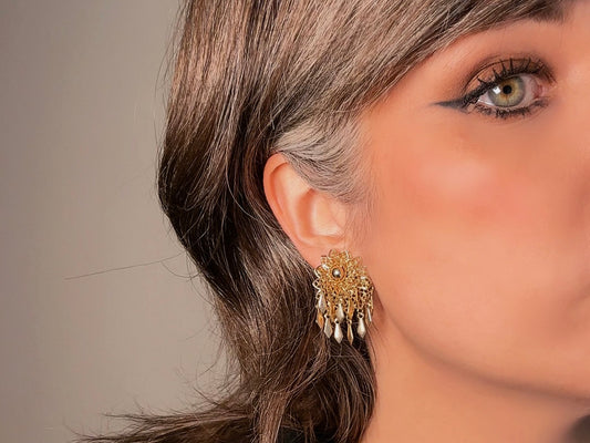 Gold Filigree Earrings with Tassel Charms, Vintage 60s Statement Earrings, Gold Lace Clip Ons