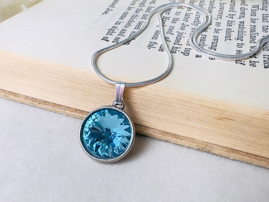 Aquamarine Birthstone Necklace, Swarovski Crystal Blue Rivoli Pendant on Silver Snake Chain