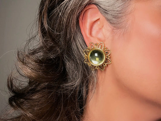 Chartreuse Celestial Earrings, Vintage Signed Trifari Jelly Belly Sun Earrings, Green and Gold Moonglow Domed Glass Clip On Earrings