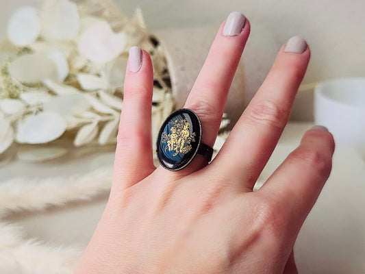 Gemini Zodiac Ring, Black Vintage Astrology Glass Cameo Ring with Gold Etching