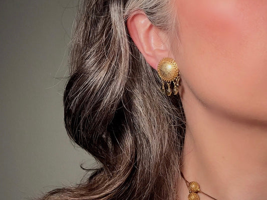 Gold Disc Earrings with Bronze Crystals, Etruscan Vintage 70s Trifari Earrings, Dainty Chandelier Clip Ons