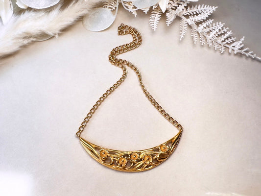 Gold Monet Flower Choker Necklace, Crescent Pendant with Floral Cut Out Design on Gold Chain