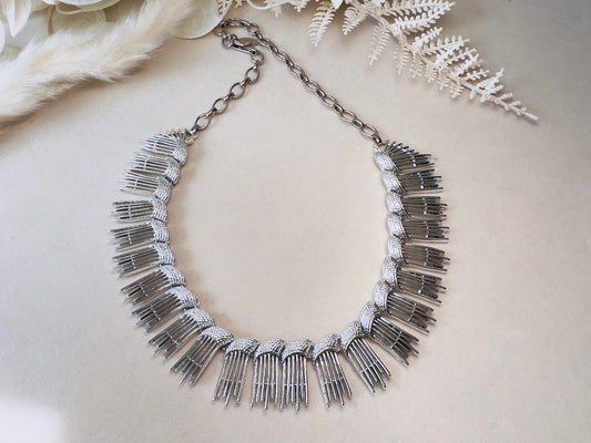 Vintage Silver Choker, Bold 60s Metallic Spike Statement Necklace, Adjustable Hook Closure