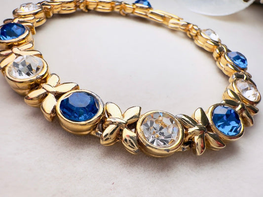 Vintage Tennis Bracelet with Sapphire Blue and Diamond Rhinestones, XO Gold Link Bracelet with Fold Over Clasp