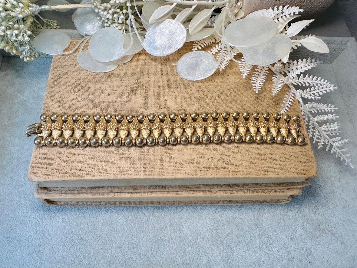 This 1970s Egyptian Revival gold panel bracelet is striking. This vintage articulated chunky gold panel bracelet features polished round gold beads and unique barrel beads with textured stippled centers. Fully beaded, this gold plated metal bracelet has a fold over hinge clasp and looks amazing paired with others for a stack or bold enough to stand on its own. Incredible vintage jewelry piece to add to your collection. Excellent vintage condition, please see all pics.