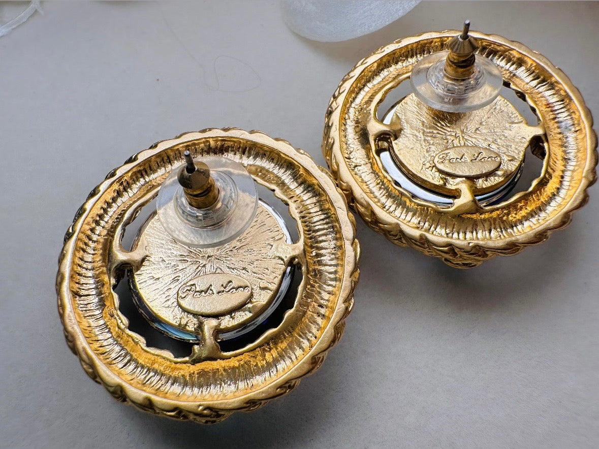 These vintage Park Lane gold rope earrings with cobalt blue cabochons are absolutely out of this world! Vibrant deep blue cabochons glow as they are surrounded by an intricate gold rope border that is accented with four more smaller blue jewels. These stones are so vibrant and vividly pop against their gold setting. Ultimate 80s mega star vibes, post style for pierced ears. Highly collectible signed designer pair in excellent vintage condition, no major flaws to note.