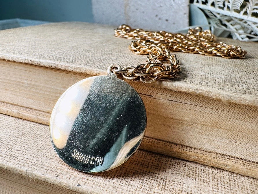 This vintage zodiac pendant necklace is a perfect find. This beautiful embossed coin style pendant depicts Aries' sign of The Ram with stars and a textured etched background. Chain is medium sized, twisted rope style. Signed Sarah Coventry from the 1970s in great vintage condition. Please view all pics.