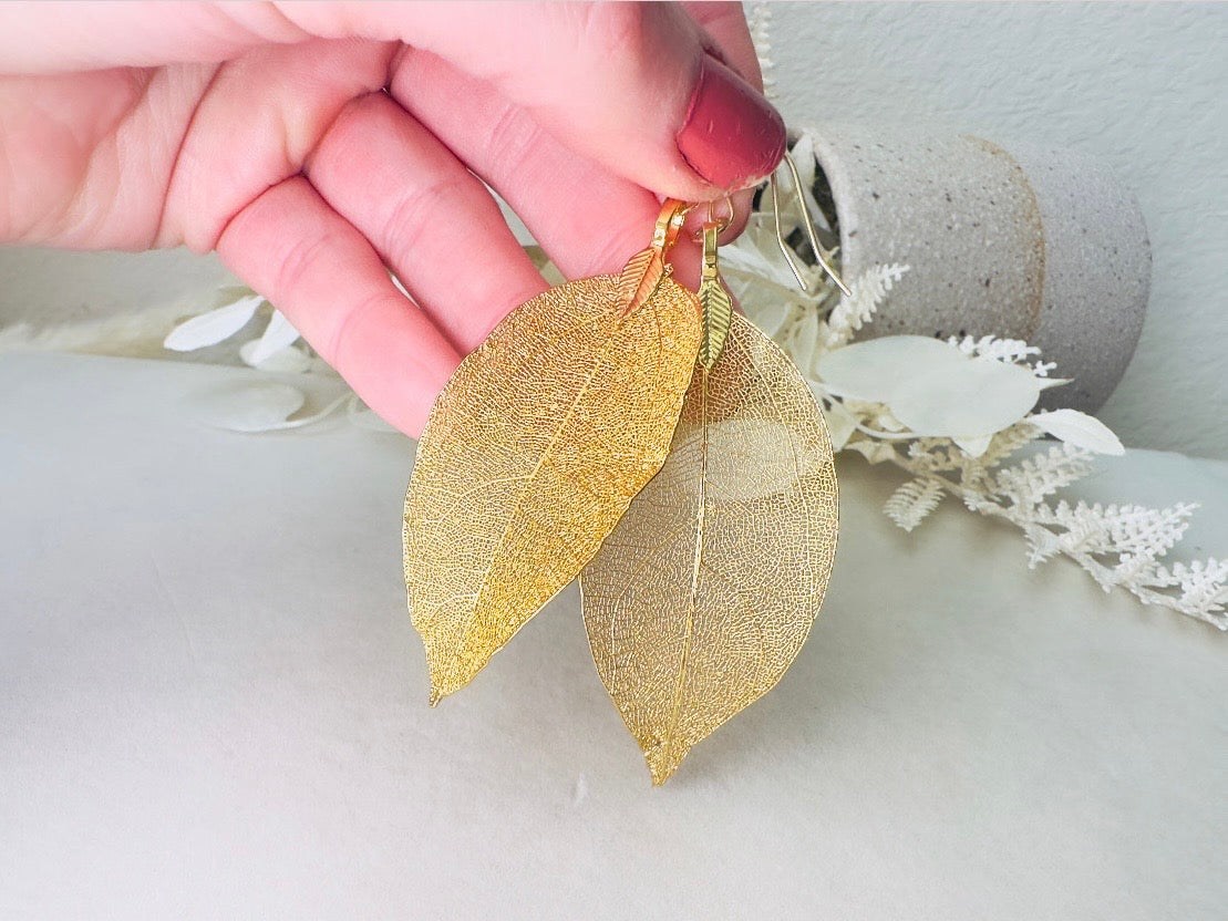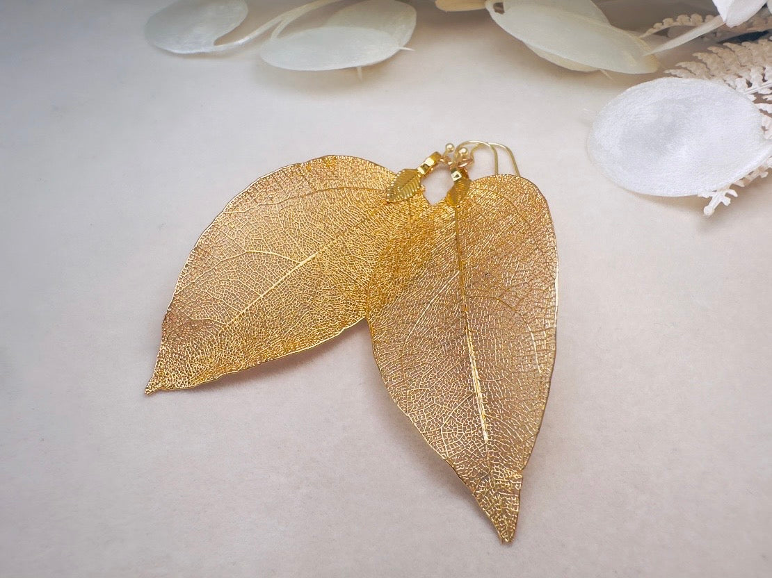 Dimensions: These earrings are approximately 2"-3" inches long and up to 2" wide. Size and shape varies slightly as these are natural leaves. Pairs are always matched with a mate most similar.