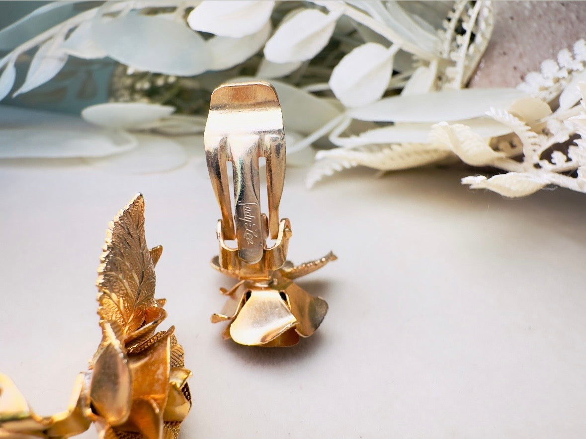 Gold Rose Earrings, Vintage 1960s Clip On Earrings, Sculptutal Gold Leaf Bridal Mesh Rose MCM 60's Clip Earrings, Designer Signed Judy Lee