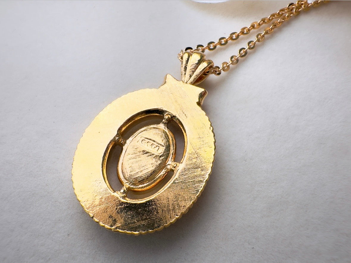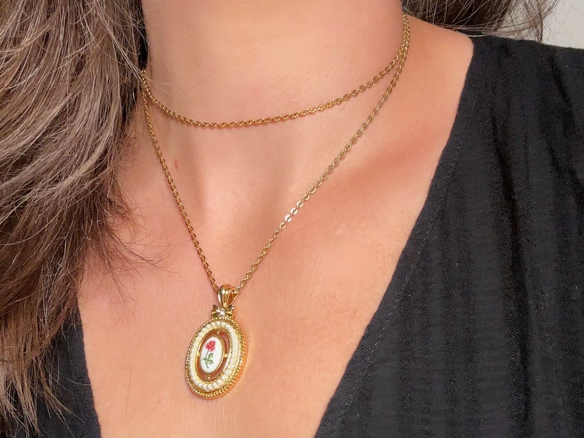 This darling vintage necklace features the most beautiful pendant. Elaborate openwork gold dotting and tiny pearls surround a porcelain cameo of a pink rose with a green stem. The pendant's bail is also elaborately detailed- a bow shape featuring a diamond rhinestone. This necklace is extra long at 31" making it perfect for layering, and has fine gold chain, in pristine vintage condition - please see pics.
