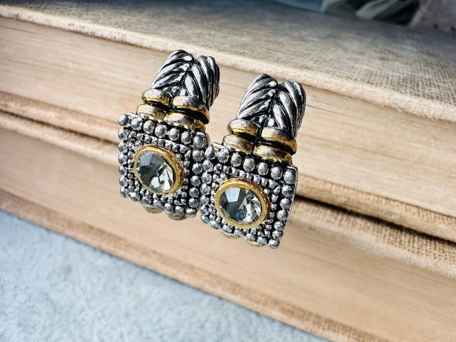 These silver and gold Etruscan vintage earrings by Premier Designs are incredible. Featuring an array of textures and elements; these huggie style earrings are antiqued silver and gold with a diamond rhinestone center. So many interesting details- the mixed metals of silver and gold, twisted braided rope, dotted rectangles and bezel set crystals. These vintage earrings are an incredible find by Premier Designs. Signed clip on style and in great vintage condition. Very minor wear- please view all pics.