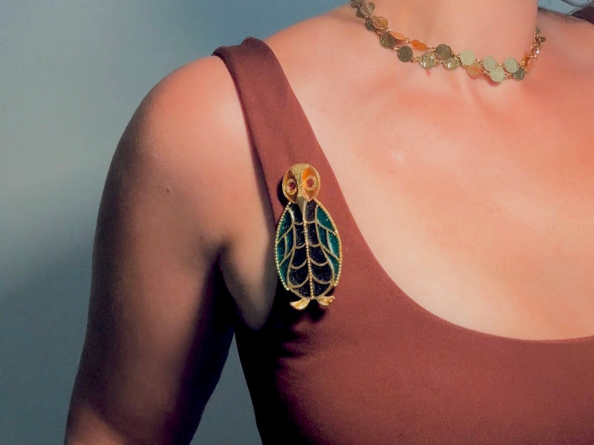 This whimsical stained glass vintage owl brooch is so unique. Featuring a brushed gold tone base and borders with beautiful stained glass accents- emerald green wings and a deep coffee brown body. The head is a golden shade with orange amber eyes. This brooch looks incredible when it catches the light. Would look amazing pinned on a dress, lapel, hat or coat. Great vintage condition, unsigned.