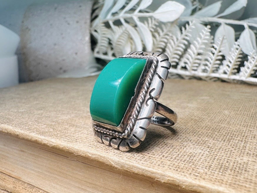 This unique vintage ring is full of cool character. Made with Mexican sterling silver, the frame of the ring is rectangular with etched carvings on the outermost edge and a roped border around the stone. The green
