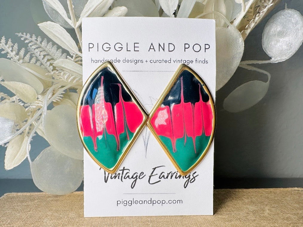 These 1980s vintage earrings are wildly unique! Pierced style, oversized statement earrings in an interesting geometric shape and color scheme- black dripping into a hot coral pink into a teal green. So cool and one of a kind! Great vintage condition- please see pics.