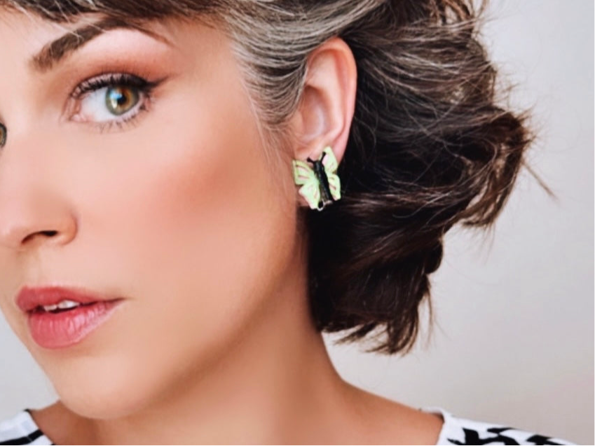 Butterfly Earrings, 1970s Vintage Earrings in Green and Pink, Unique Colorful Enamel Clip-On Statement Earrings, Pretty Pastel Butterflies