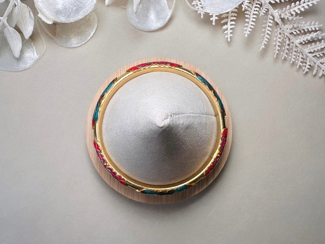 This vintage Cloisonne bracelet is absolutely beautiful. Gold toned with romantic pearlized enamel inlay in blues, berry reds and pinks with floral and butterfly motif. Skinny style bangle looks great paired with others. Great vintage condition with very minor wear- please see pics.