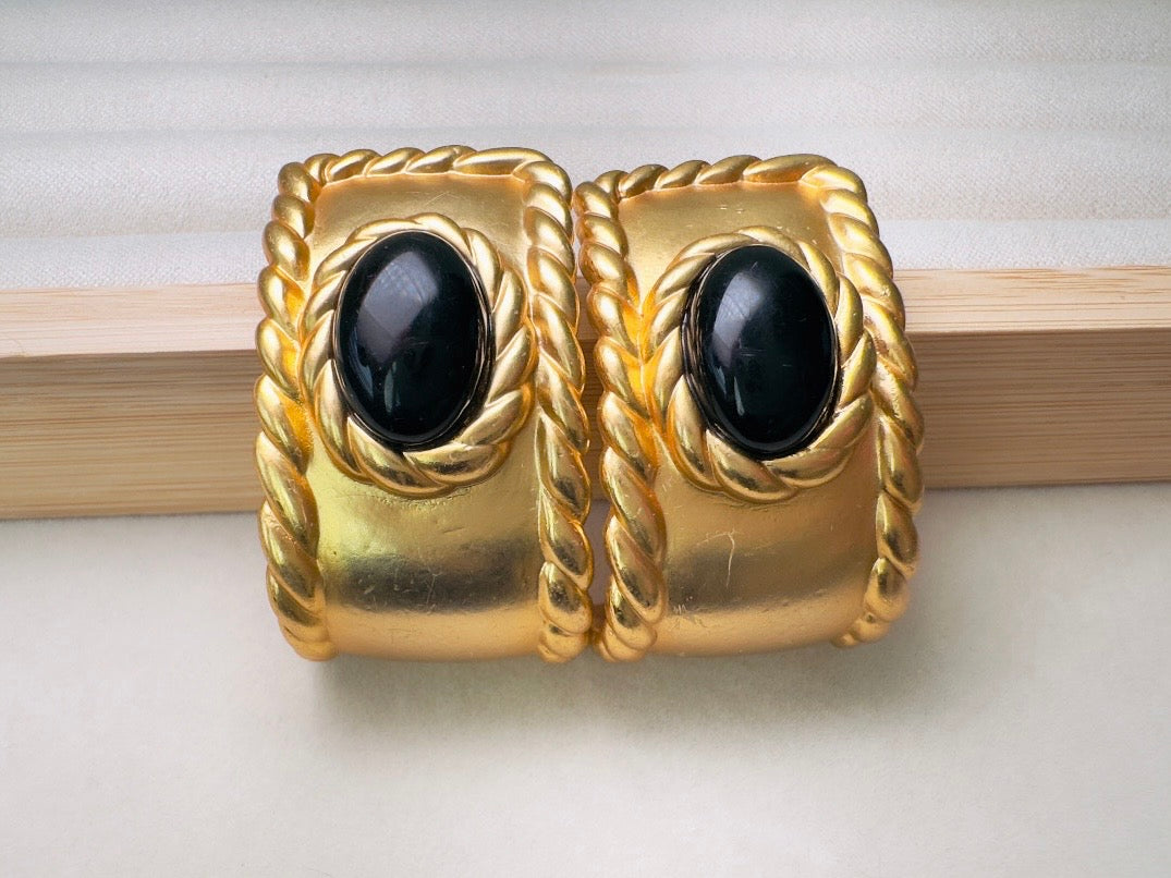 These vintage statement earrings are absolute stunners in black and gold. These 1980s earrings are iconic- featuring matte gold half hoops with black onyx cabochons and a textured rope border, these earrings are incredible. Etruscan style vintage estate jewelry is trending big right now in the fashion realm- for obvious reasons. These dramatic and one of a kind earrings are clip on style, great vintage condition!