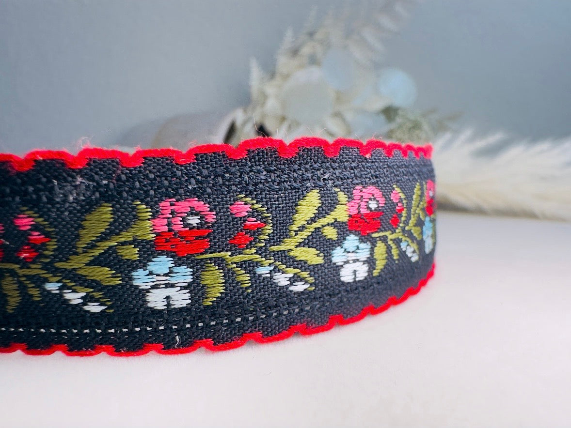 This vintage flower choker is a handmade double sided reversible black velvet necklace with Victorian Rose and Forget-me-not Jacquard ribbon. A must have versatile choker for your jewelry collection-two looks in one! An iconic thick black velvet choker goes with everything.