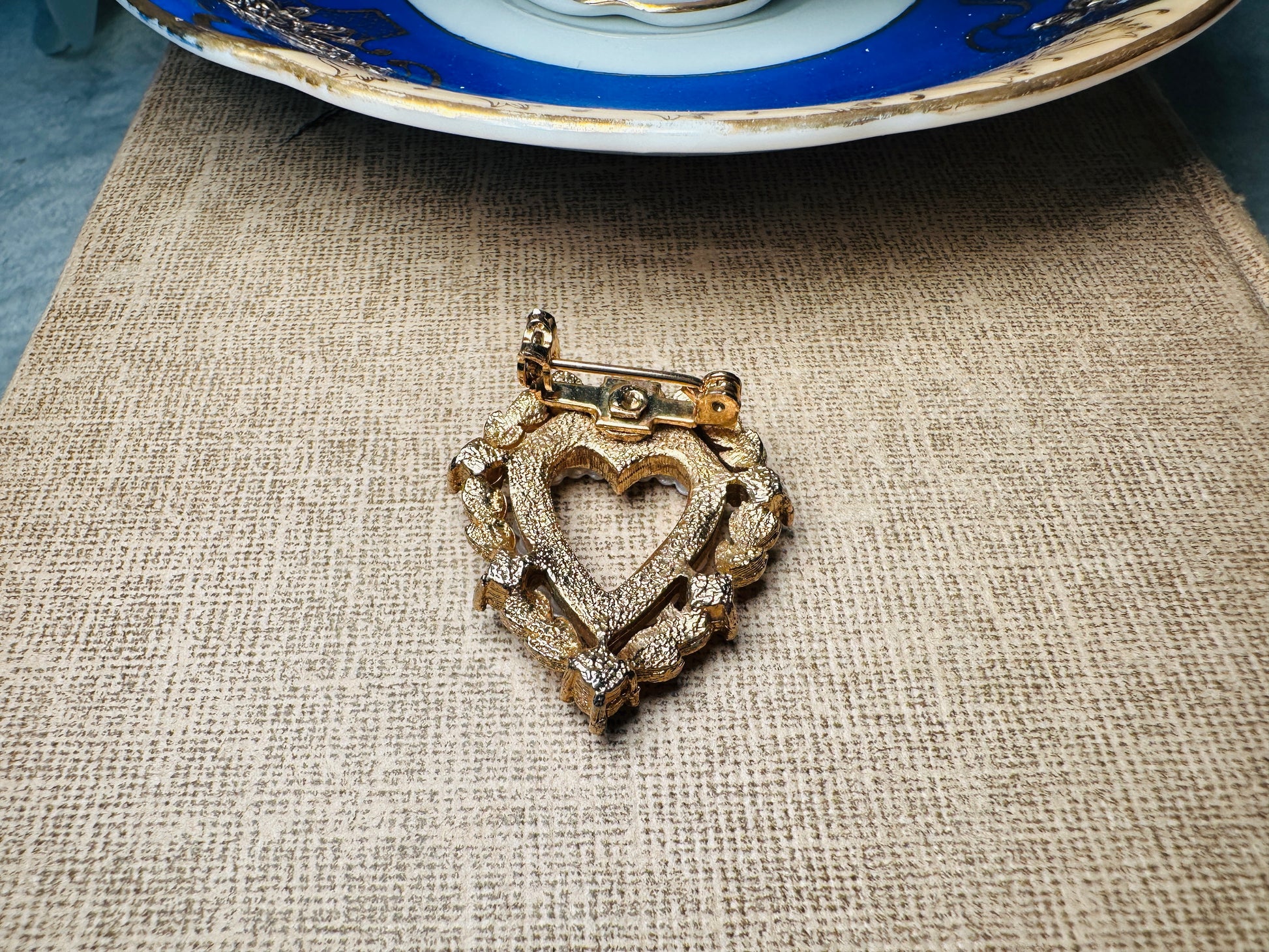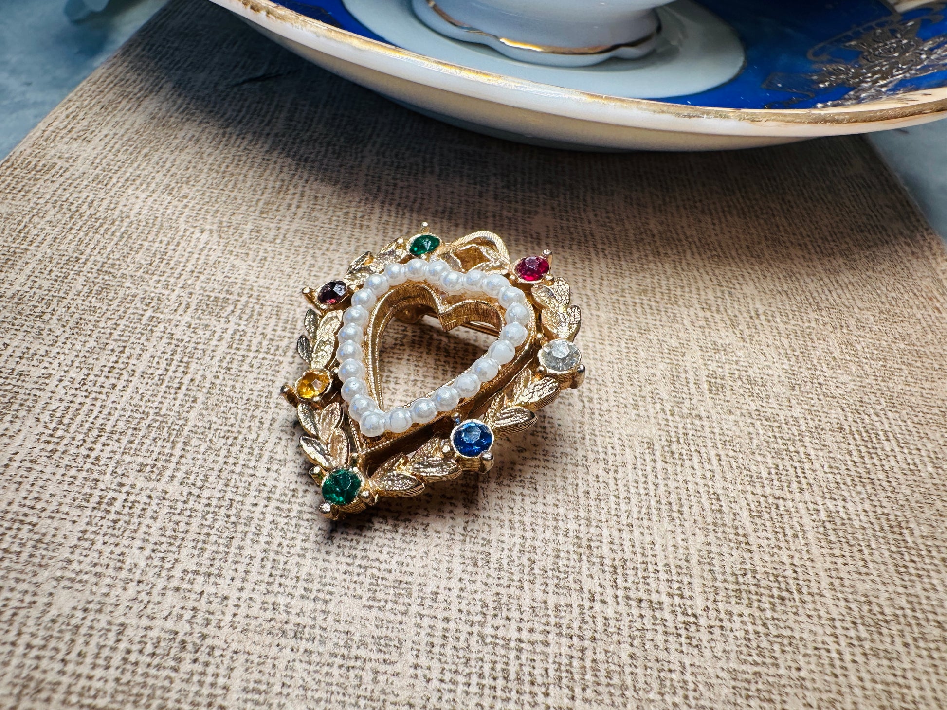 Vintage Heart Brooch, Bridgerton Inspired Romantic Regency Era Cottagecore Gold Heart Pin with Pearls and Rhinestones in Red Green and Blue