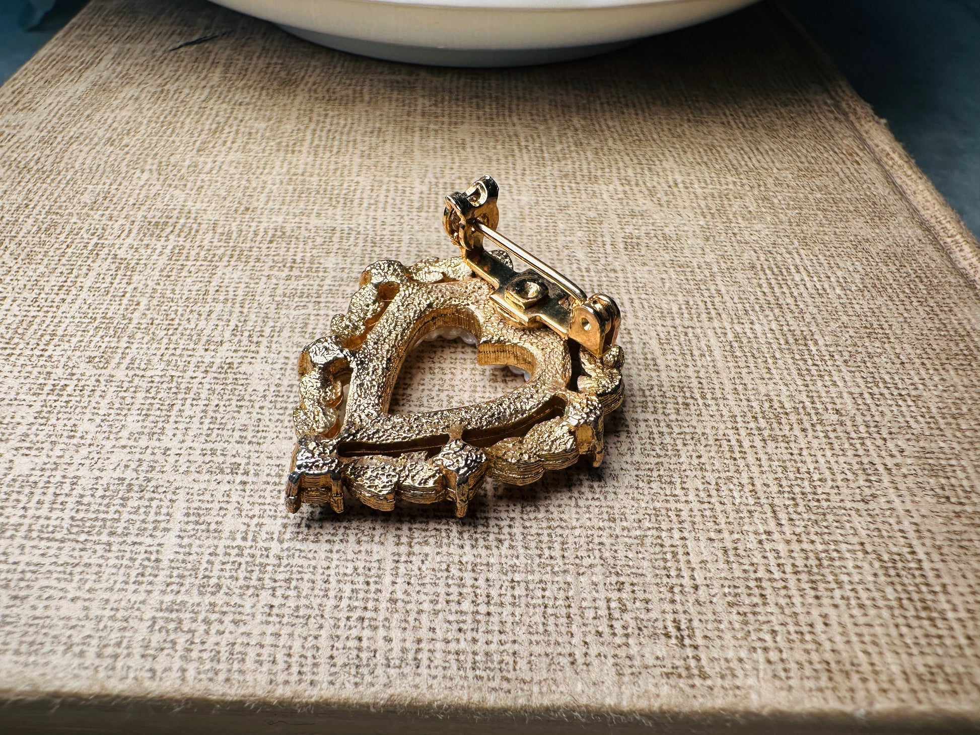 This vintage heart brooch is beautiful. Featuring a detailed antique gold heart composed of tiny leaves with a petite pearl border. The leaves are dappled in rhinestones in blue, red and green. This is a double- feature as there is a inconspicuous bail at the top of the brooch- easily add it to your favorite chain to transform into a pendant necklace! Fully working pin and lock, great vintage condition please see pics. This pin has such a romantic vibe and would spice up any jacket, scarf or hat.