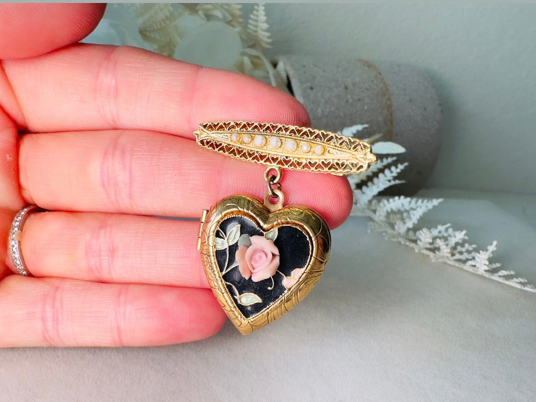 Vintage Heart Locket Brooch, Victorian Pearl Bar Pin Romantic Regency Era Embossed Gold Heart Pin with Black Heart and Pink Ceramic Rose