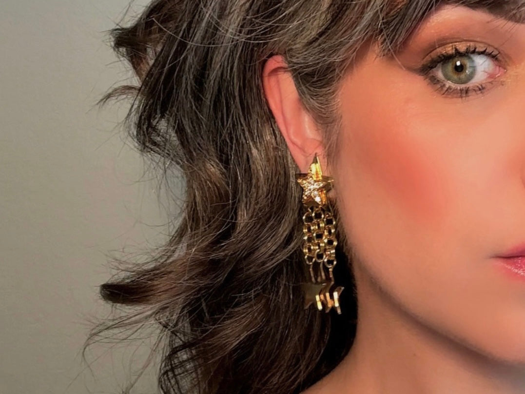 These vintage gold star dangle earrings are incredible. Featuring a large gold star base with another layered star that is covered in pave set rhinestones. From this star three chain tassels drop, each with a gold star charm dangling from the end. These are clip on style, and in great condition. A fantastic 1980s pair!