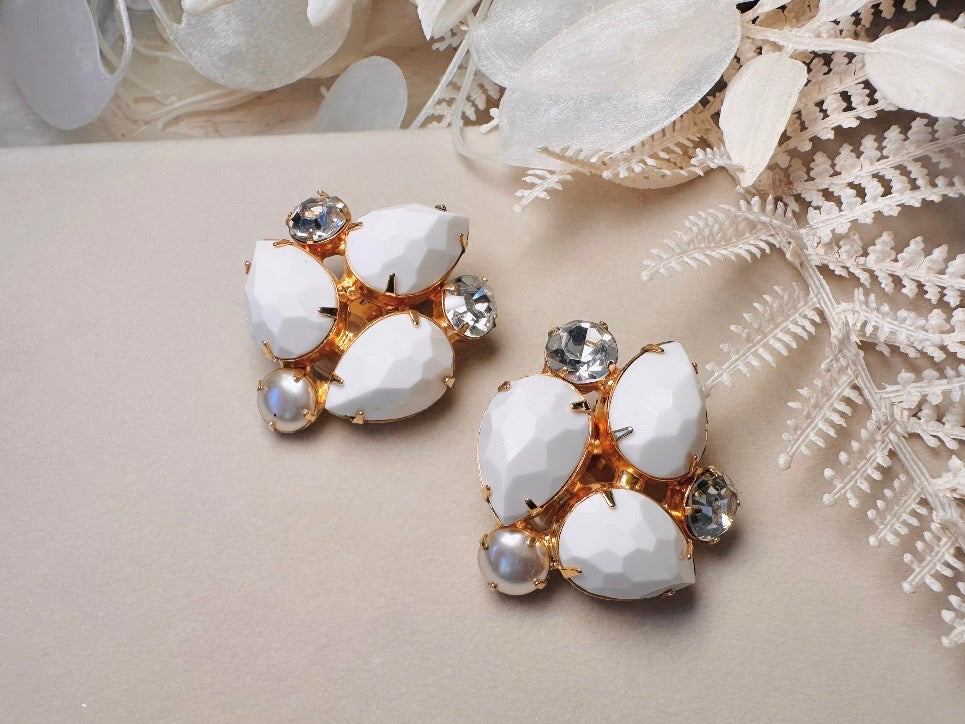 These vintage white earrings are an incredible pair of 1960s cluster earrings. Featuring opaque white faceted pear shaped stones, glass pearls and diamond rhinestones, these gold plated clip on earrings are fantastic. Each stone is prong set in a geometric pattern that mirrors each earring. A show-stopping rare pair of vintage earrings for a cocktail reception, award ceremony or wedding. Excellent vintage condition, please view all pics.
