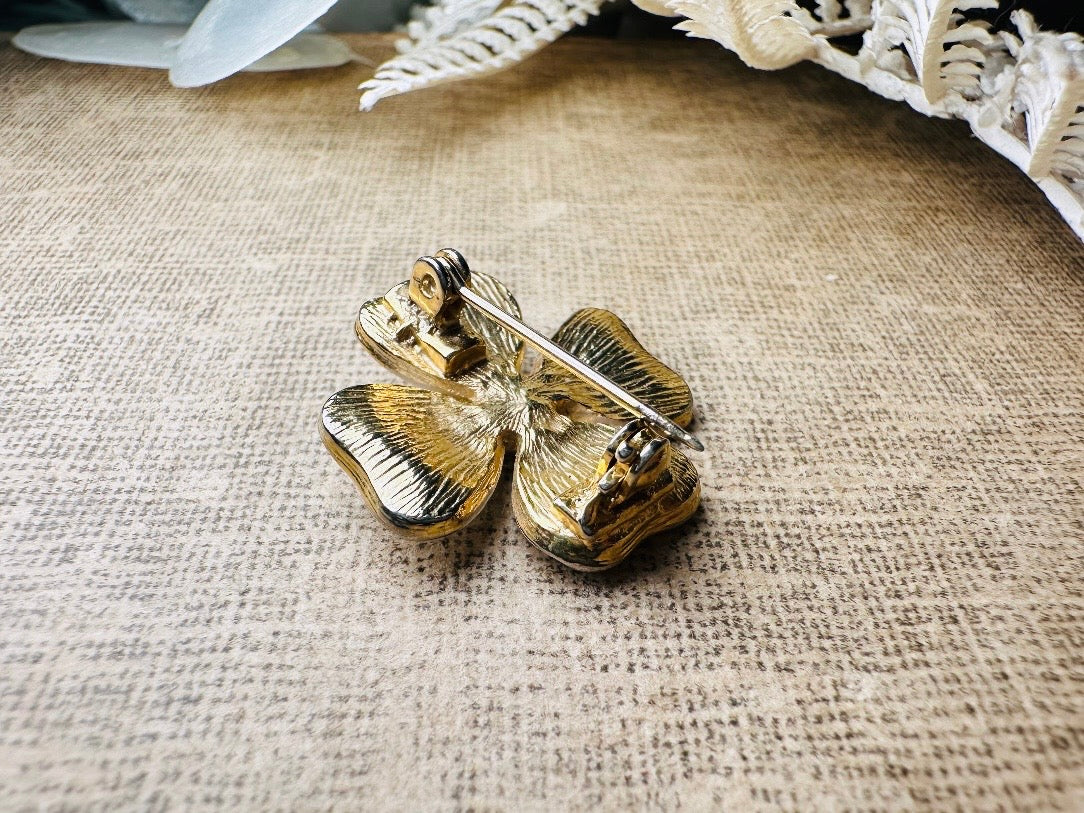 This white and gold dogwood flower brooch is so pretty. Glossy white enamel with gold trim, and gold tone base makes a darling combination. Dogwood flowers are so beloved and it's easy to see why. This vintage flower brooch has a fully working pin and lock.