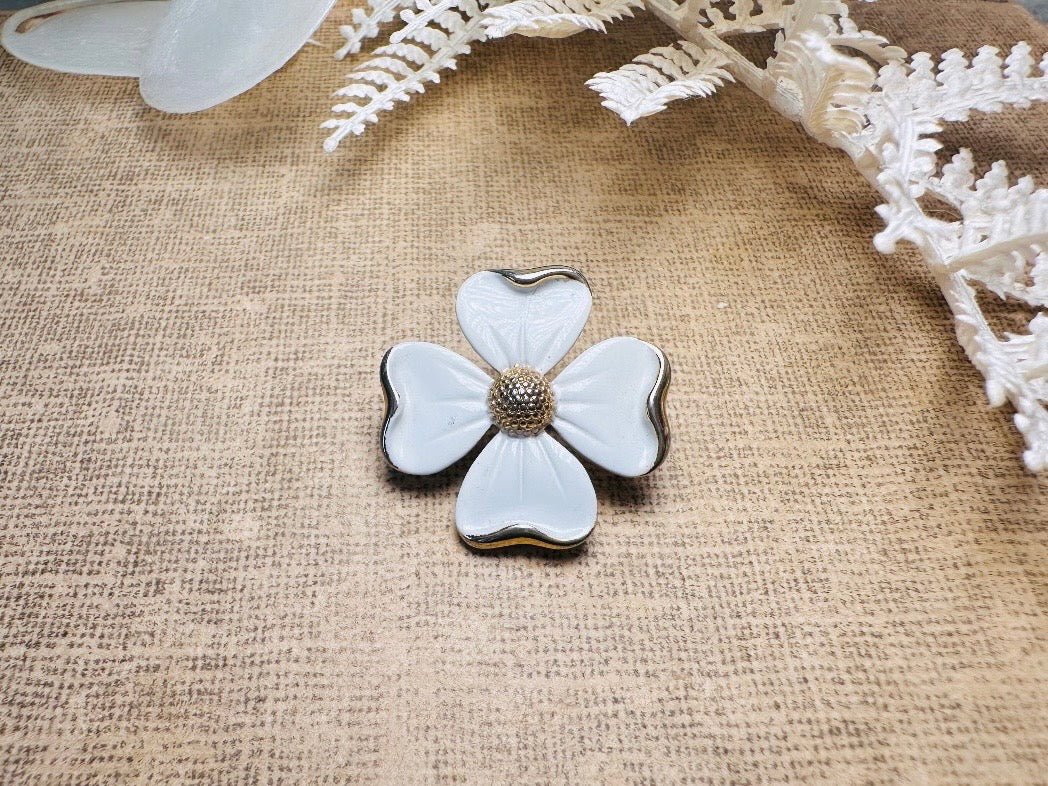 White Dogwood Brooch with Gold Trim, Vintage Flower Brooch, White Enamel Floral Pun, Pretty Flower Shabby Chic Wedding Something Old Bride