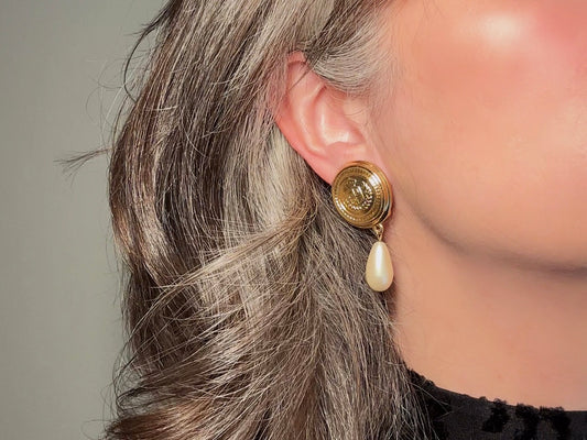 Etruscan Pearl Drop Earrings, Vintage Liz Claiborne Shield Clip On Earrings with Signaure Gold LCI Laurel Crest