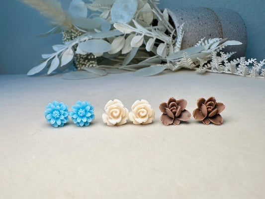 Flower Earrings Set in Blue Cream and Brown, Handmade Cute Floral Resin Stud Earrings