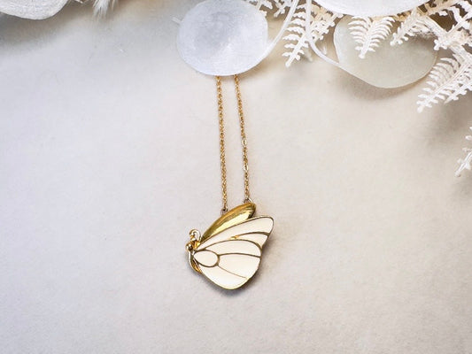 Gold Butterfly Necklace, Vintage Monet Pendant Necklace, Delicate Gold Chain with Cream and Gold Enamel