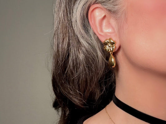 Gold Vintage Earrings, Floral Napier Pierced Drop Earrings with Flowers and Golden Teardrops