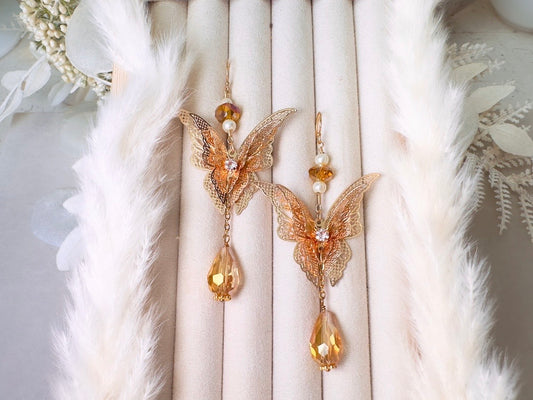 Golden Butterfly Earrings, Handmade 14kt Gold Filigree Dangle Earrings, Crystal and Pearl Celestial Faerie Earrings