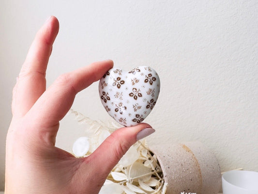 Heart Jewelry Box, Vintage Milk Glass Japanese Trinket Box, White Porcelain Fine China with Brown Flowers