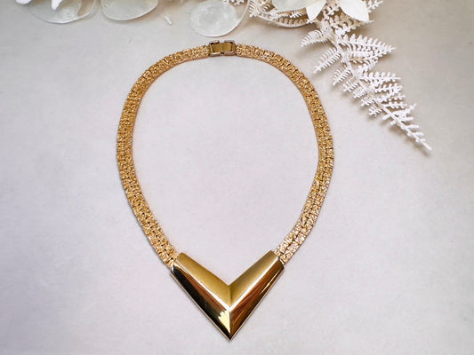 Vintage Gold Chevron Necklace, 80s Golden Nugget Chain Choker with V Bar Pendant, Bold Statement Necklace